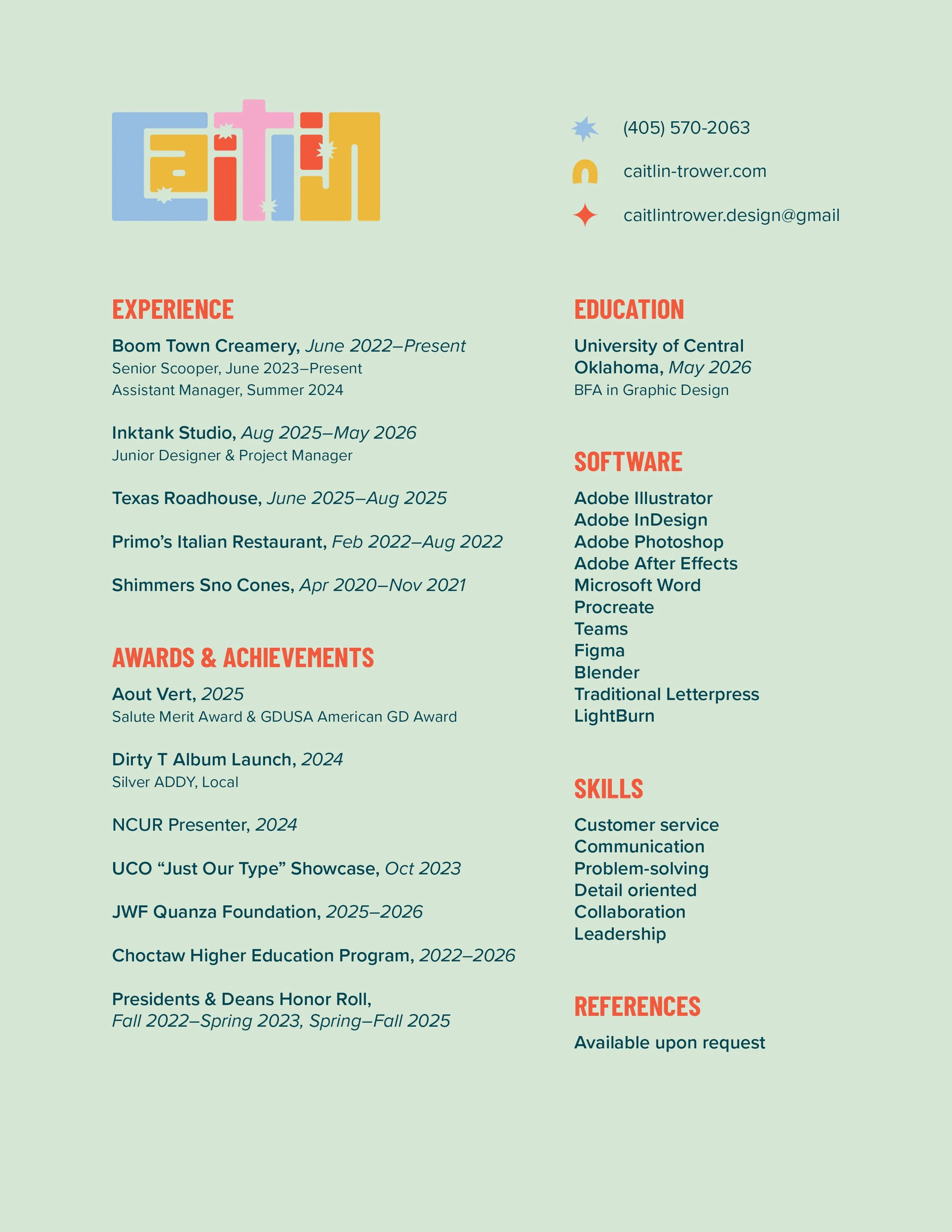 Hello, I am Caitlin Trower, a junior graphic designer based in OKC. I am the missing piece that completes the larger puzzle you are trying to solve by bringing clarity, balance, and purpose to every project. I blend logical thinking with creative problem-solving that delivers solutions that not only work but also stand out. By adapting to each client’s unique needs, I create work that is both functional and expressive. My approach is bold, energetic, and driven by fun ideas and bright, engaging visuals. I look forward to working with you!