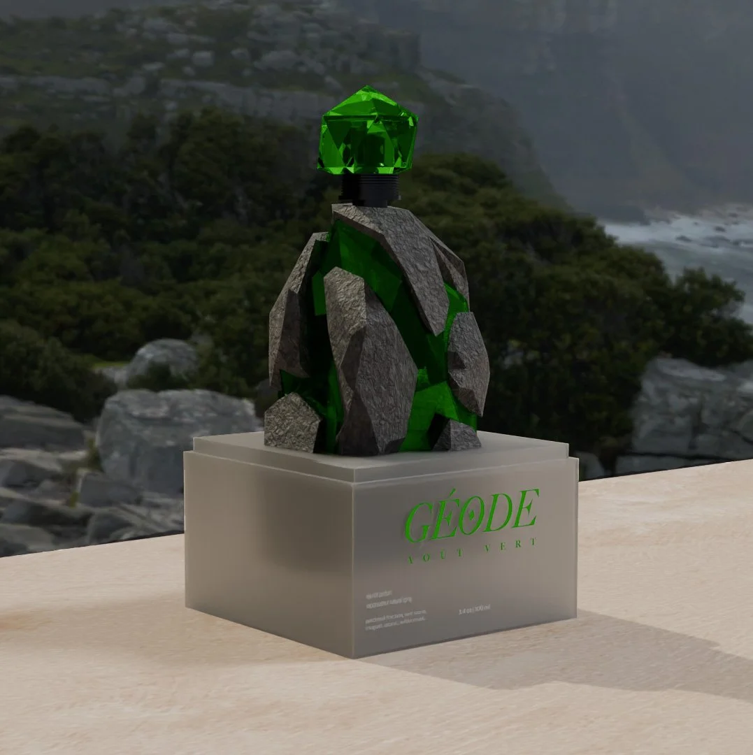 A custom, 3D-modeled perfume bottle featuring a cracking, hard rock-like exterior that reveals a beautiful bottle representing a peridot gem. Packaging for the bottle is frosted, alluding to the experience of discovery inside