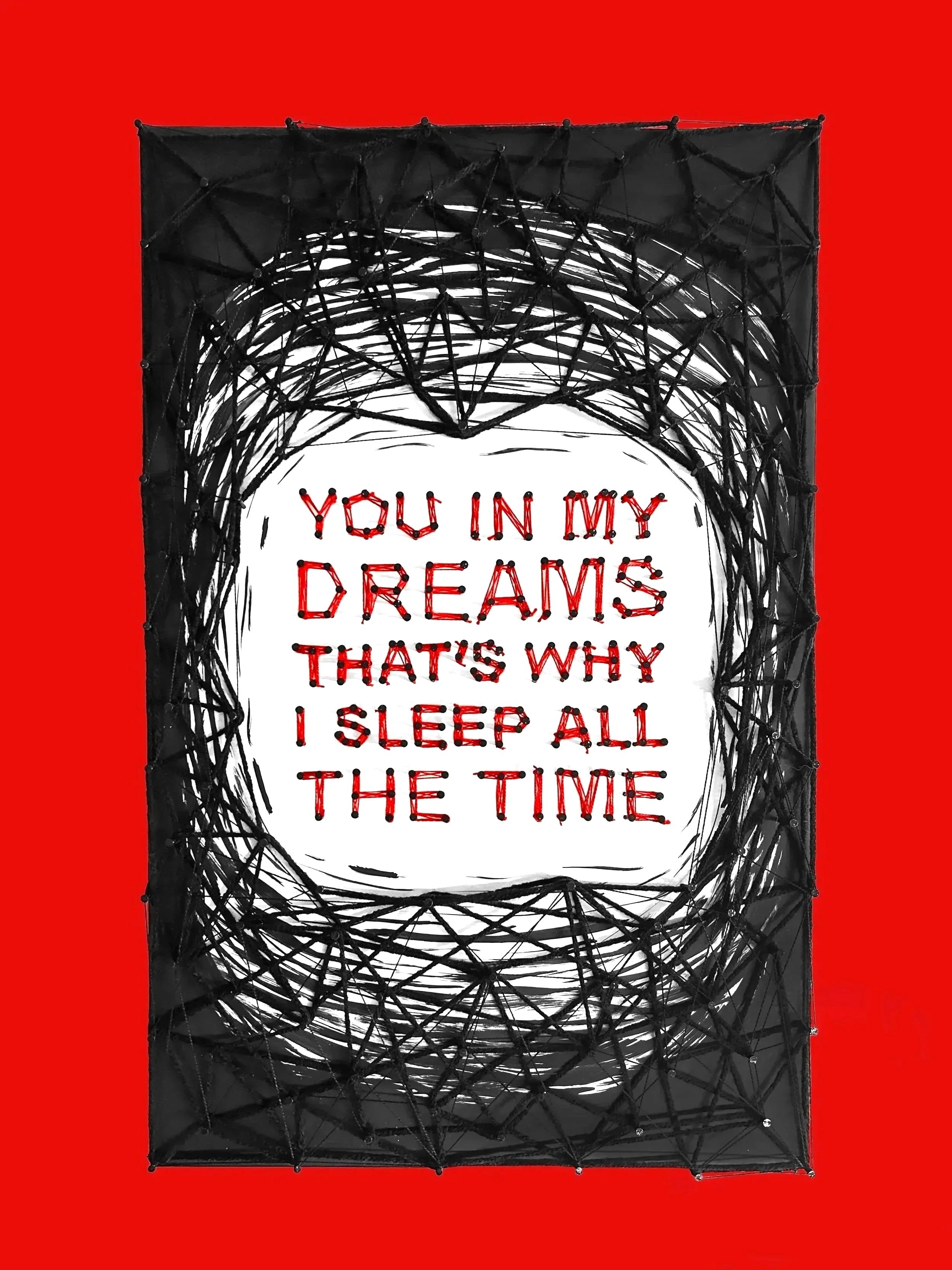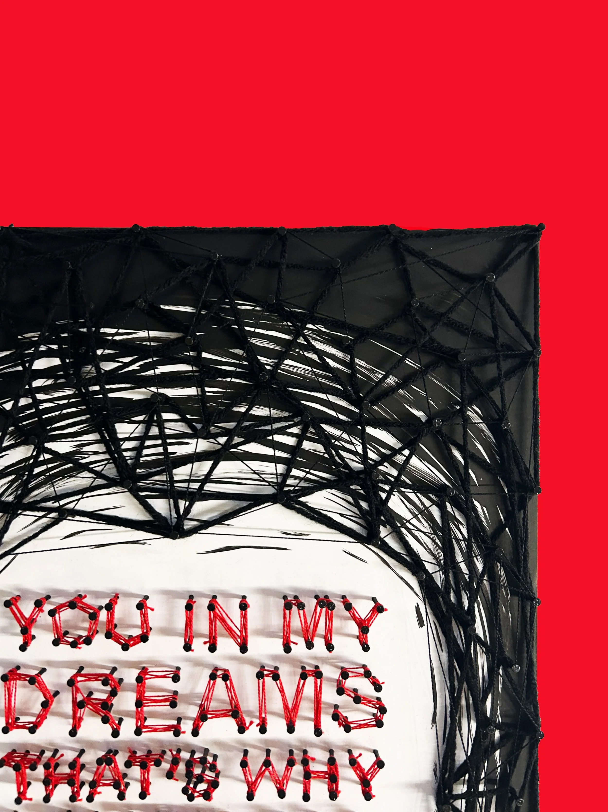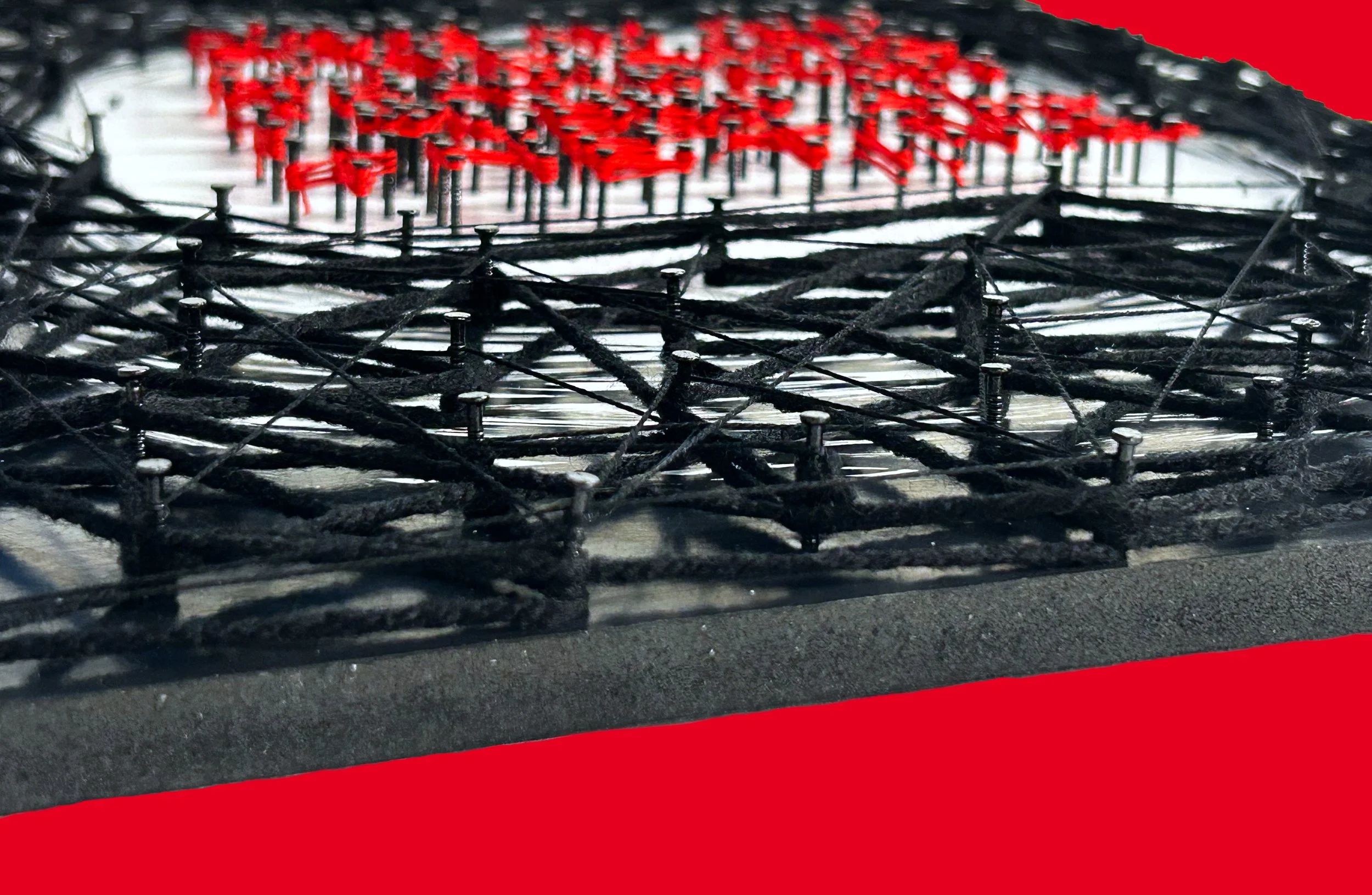 A mixed media poster that uses yarn, string, nails, black ink, and poster board. Giving the impression of being trapped by grief.