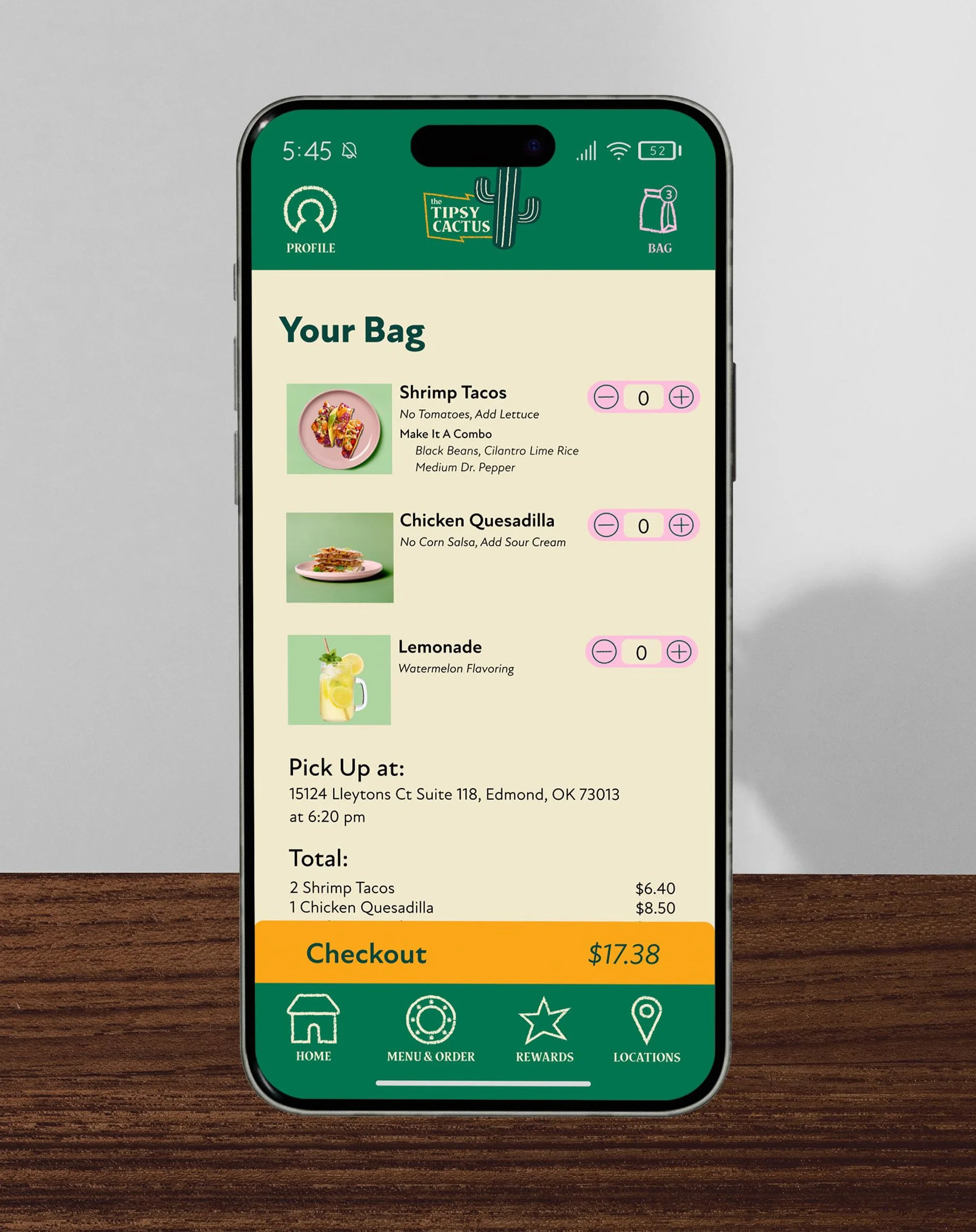 A mobile ordering app for the Mexican restaurant The Tipsy Cactus that features distressed line illustration to bring out the playfulness of the brand.