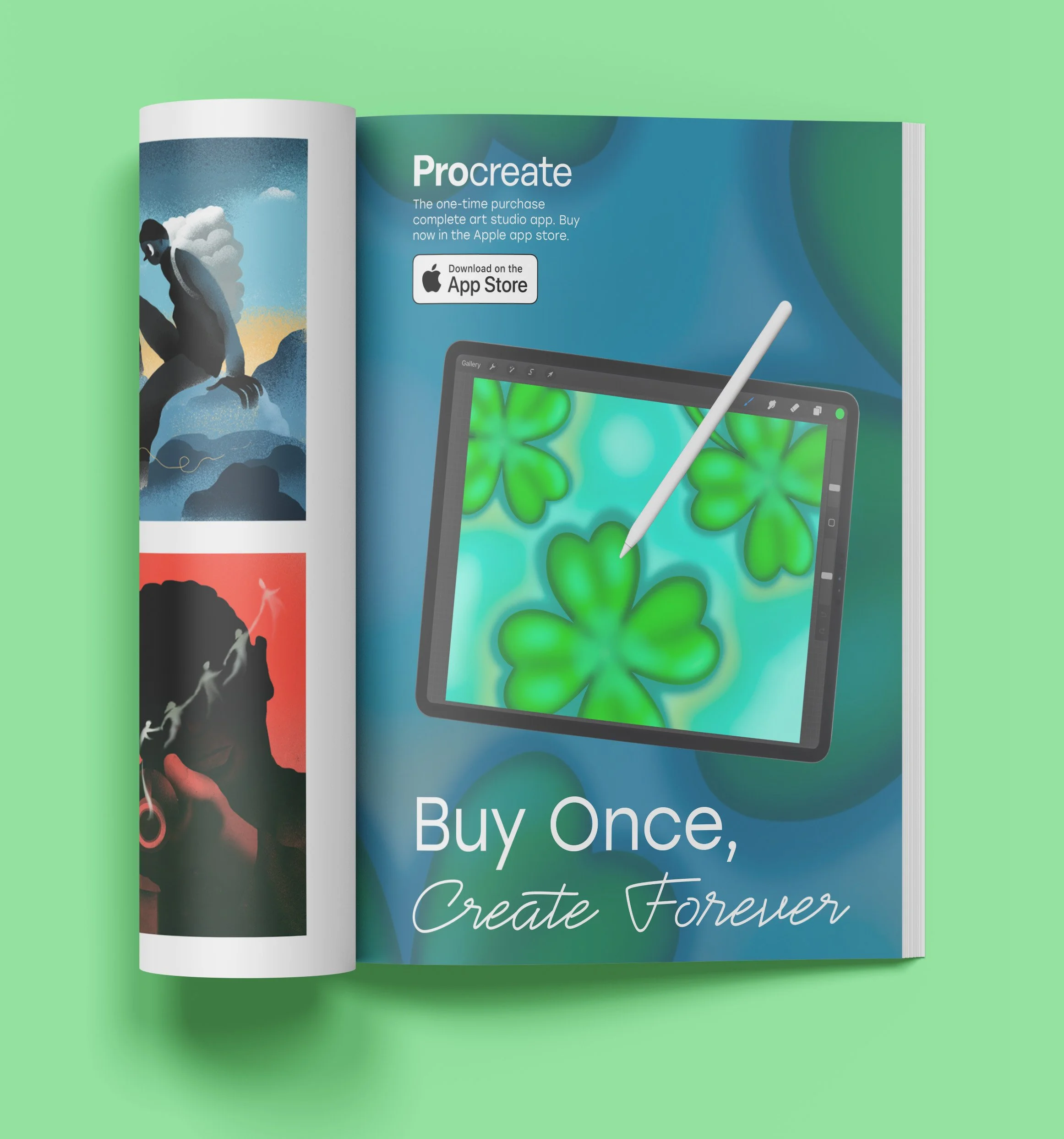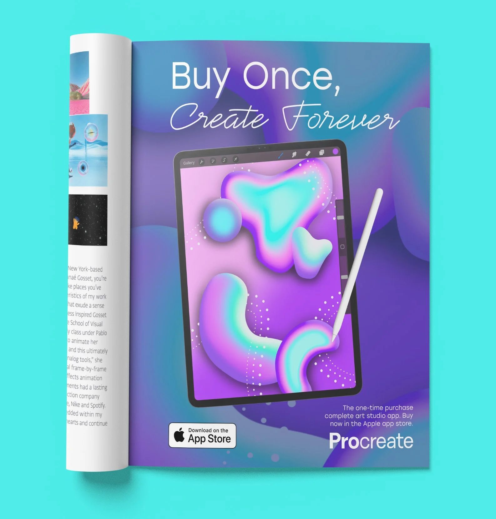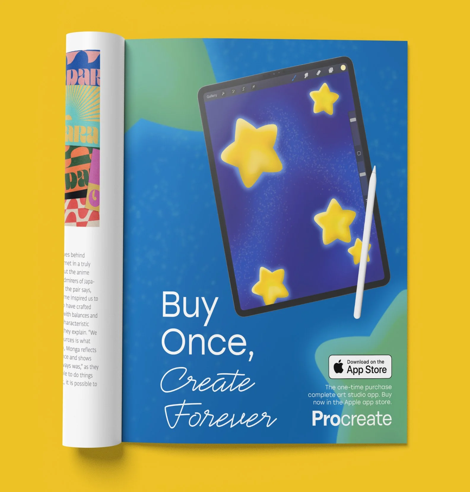 Procreate is a one-time purchase art studio app. The drawings and a cursive hand-like font help show its capabilities and what it can be used for. Bright colors then draw in the consumer.