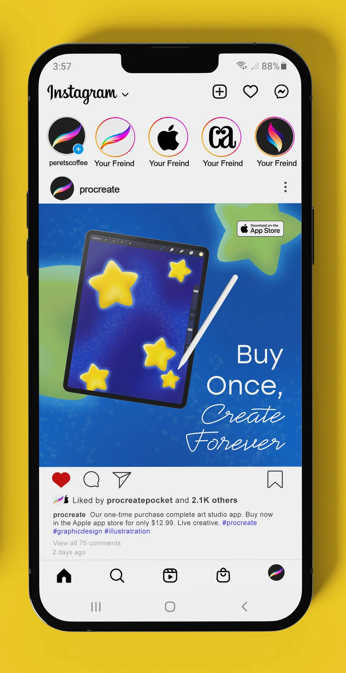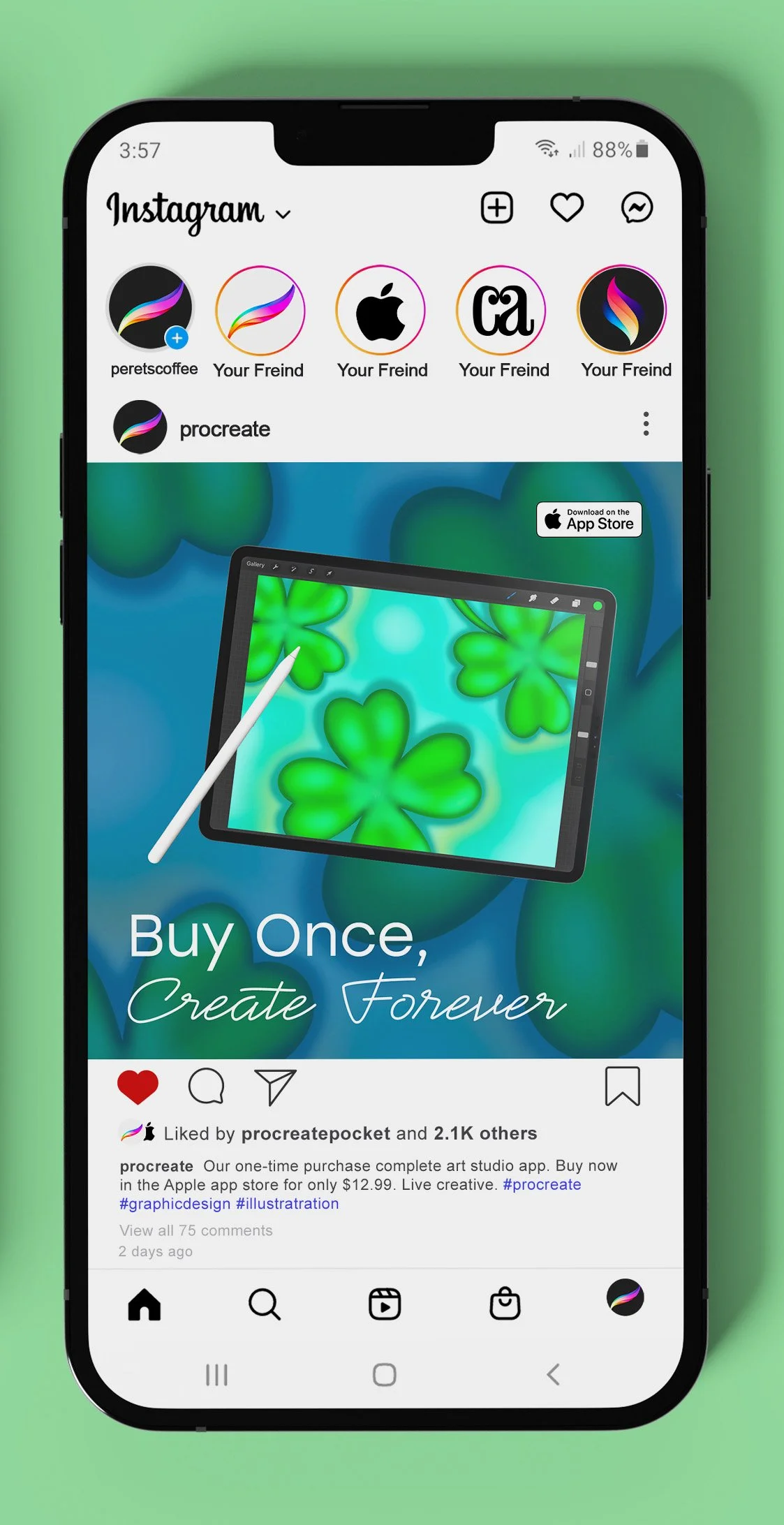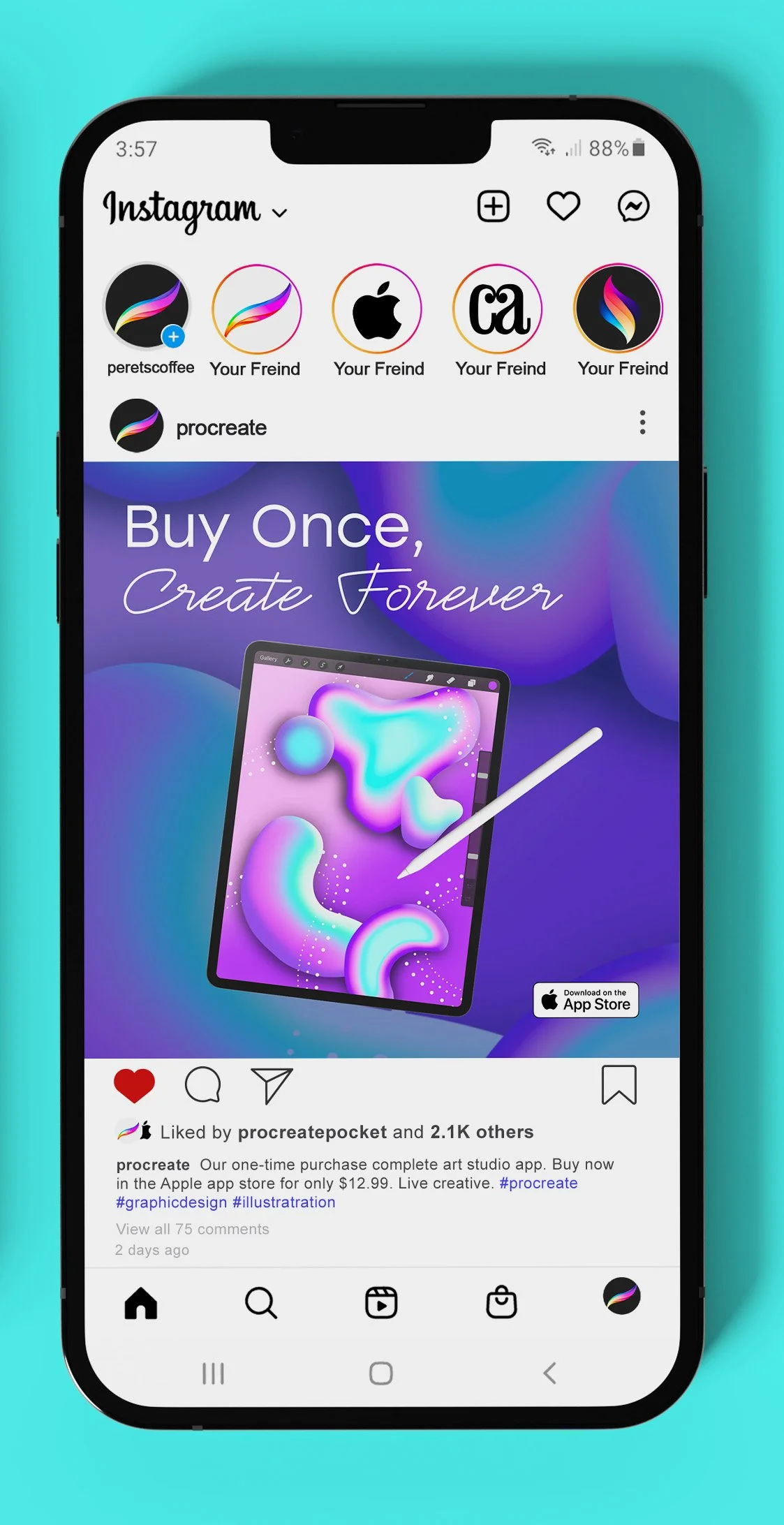 Procreate is a one-time purchase art studio app. The drawings and a cursive hand-like font help show its capabilities and what it can be used for. Bright colors then draw in the consumer.